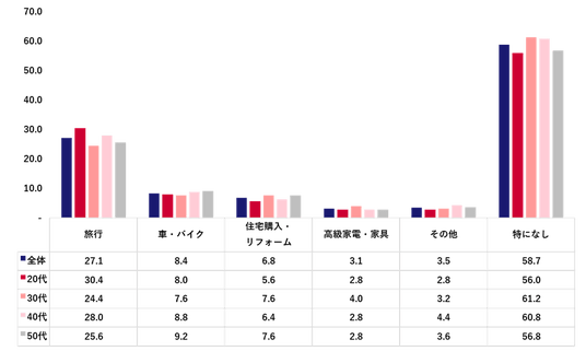 「節約を緩めてでもしたい大きな買い物」については、「特になし」が全ての年代で約6割を占めた。一方で「旅行」が次点で高く、全体で27.1%だった。