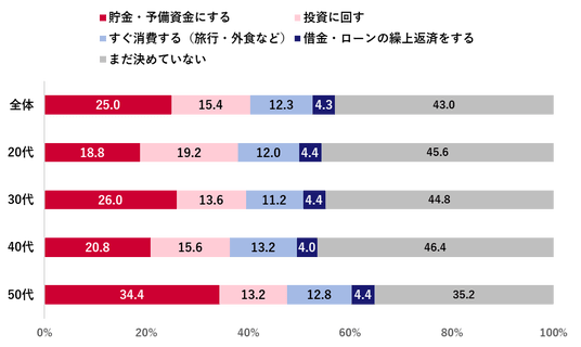 仮に2026年に減税が行われたり、給付金などの支給があったりした場合の最初のお金の使い道を聴取した。「まだ決めていない」が全体の43.0%でトップ、次いで「貯金・予備資金にする」(25.0%)、「投資に回す」(15.4%)となった。「すぐ消費する」が12.3%で続き、消費よりも“備え・投資”意向が優勢となった。