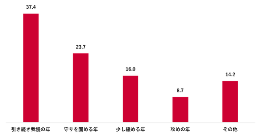 2026年についてお金の面でどんな年になりそうか尋ねたところ、「引き続き我慢の年」(37.4%)、「守りを固める年」(23.7%)が上位となった。約6割が“節約・防衛モード”を想定している。