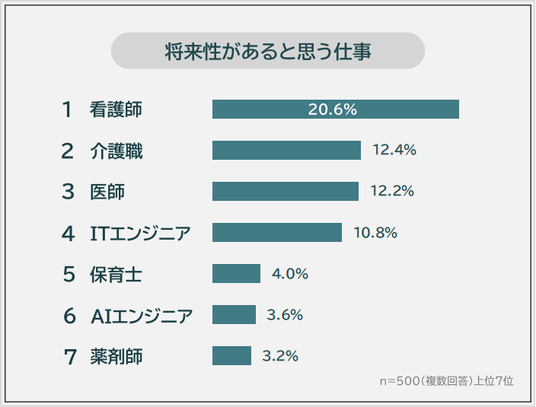 「将来性があると思う仕事」を聞いたところ、1位は「看護師(20.6%)」でした。2位は「介護職(12.4%)」、3位は「医師(12.2%)」となっています。