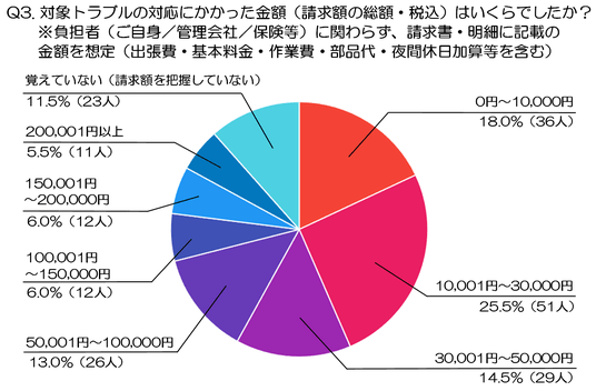 Q3.対象トラブルの対応にかかった金額(請求額の総額・税込)はいくらでしたか?※負担者(ご自身/管理会社/保険等)に関わらず、請求書・明細に記載の金額を想定(出張費・基本料金・作業費・部品代・夜間休日加算等を含む)