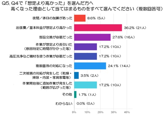 - そのほか、「作業が想定より長引いた(原因特定に時間がかかった等)」17.2%(10人)、「高圧洗浄など機材を使う作業が必要だった」17.2%(10人)、「作業開始後に追加作業が発生した(範囲が広がった等)」17.2%(10人)と、作業内容や工程の増加に起因する理由も同程度挙げられています。水回りトラブルは、見た目以上に原因が複雑な場合も多く、作業を進める中で想定外の対応が必要になるケースが一定数あることが分かります。