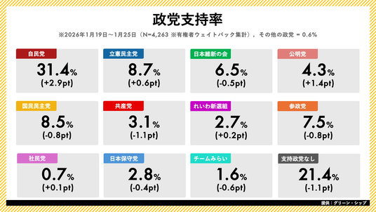 ジャッグジャパン株式会社(本社:東京都渋谷区)は、株式会社グリーン・シップ(本社:東京都千代田区)と業務提携し、グリーン・シップが提供する日次世論調査「世論レーダー」のデータを提供しております。本日、2026年1月第4週(1月19日~25日分)の内閣支持率・政党支持率調査の結果を発表いたします。