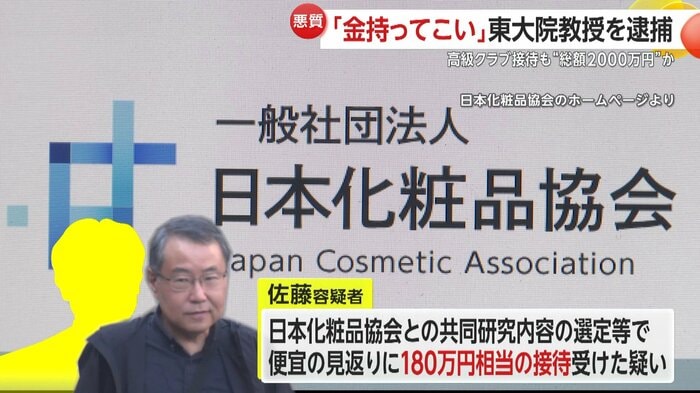 日本化粧品協会との共同研究内容の選定などで便宜を図った見返りに、佐藤容疑者は180万円相当の接待を受けた疑いが持たれている。