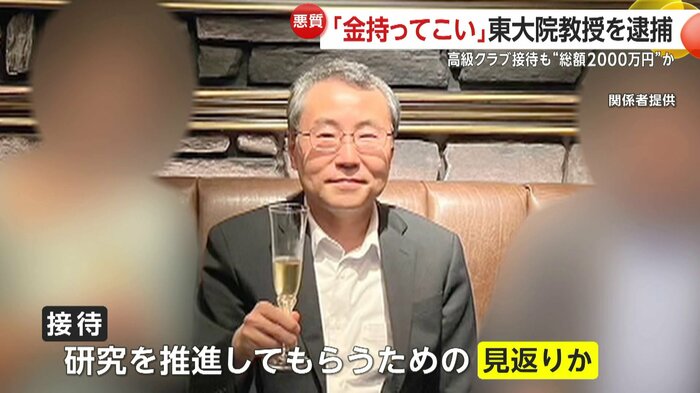 東京大学大学院の教授が、共同研究で便宜を図る見返りに高級クラブなどで接待を受けたとして逮捕された事件。