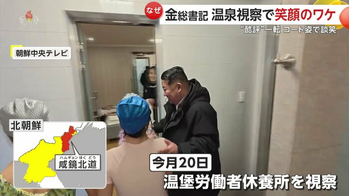 黒いロングコートに革靴という“いでたち”で温泉施設に入り、女性らと談笑する北朝鮮の金正恩総書記。