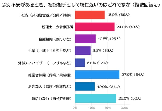 - 一方で、「特にいない(自分で判断)」と回答した人は25.0%(50人)にのぼります。不安を感じても相談先を持たず、自身の判断で対応している経営者・役員が一定数存在している実態が浮かび上がっています。