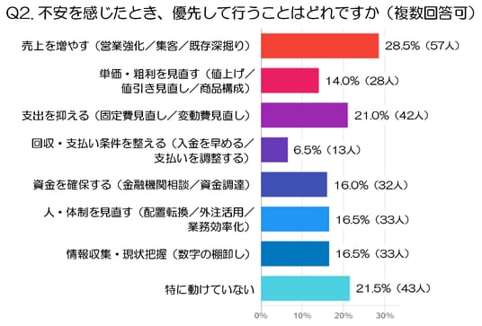 - 次いで多かったのが、「支出を抑える(固定費見直し/変動費見直し)」の21.0%(42人)です。売上拡大と並行してコストを見直し、リスクを抑えようとする現実的な判断が取られている様子がうかがえます。