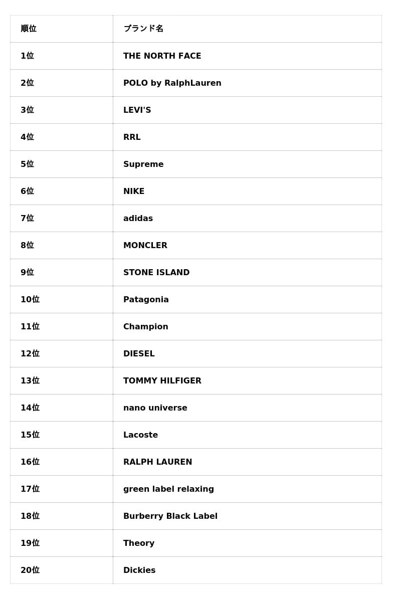 メンズでは、アウトドア・スポーツ・アメカジ・ストリート系ブランドが上位を占める結果となりました。