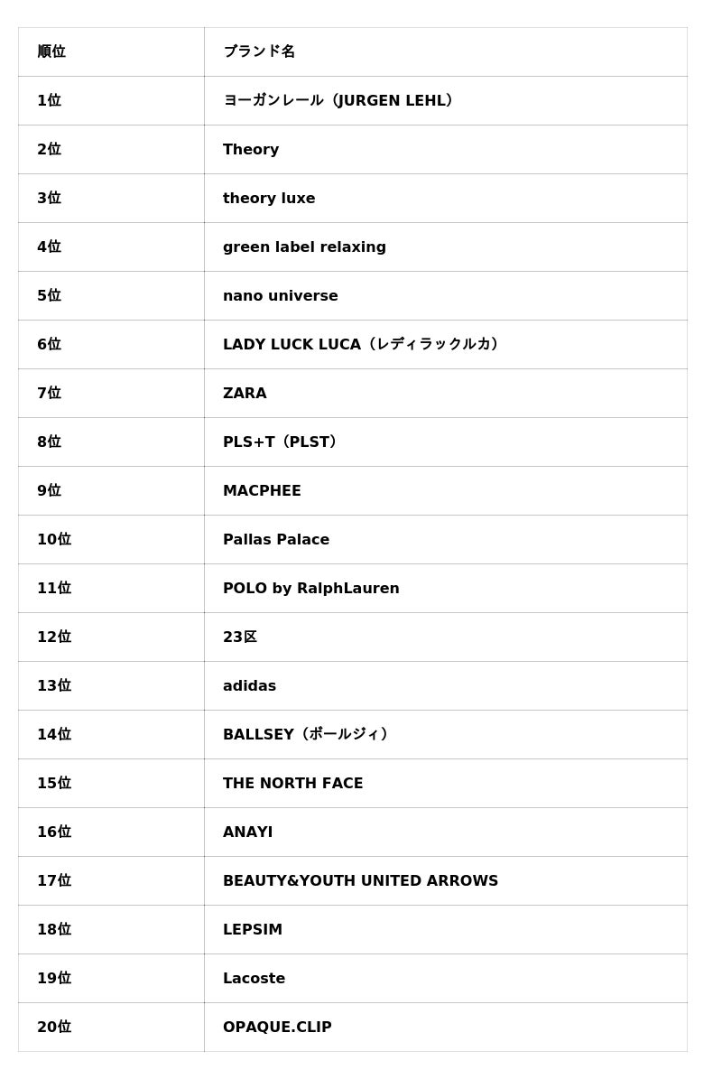 レディースでは、「ヨーガンレール(JURGEN LEHL)」「Theory」「theory luxe」など、素材や仕立てに定評のあるブランドが上位にランクインしました。