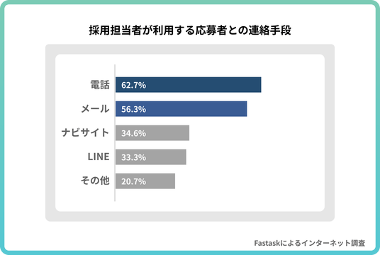 「電話」(62.9%)、「メール」(58.6%)が引き続き中心で、「LINE」は31.1%と、応募者対応時よりもわずかに低下しました。