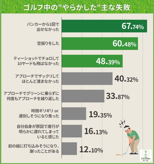 注目すべきは、実際の経験者数ではバンカー脱出失敗がで最多だったのに対し、「最も恥ずかしかった失敗」では空振りがトップとなった点です。