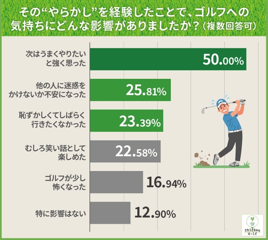 失敗を経験したことでゴルフへの気持ちにどんな影響があったかを調査したところ、「次はうまくやりたいと強く思った」が50.00%で最多となった一方、「他の人に迷惑をかけないか不安になった」が25.81%、「恥ずかしくてしばらく行きたくなかった」が23.39%となり、ポジティブな反応とネガティブな反応に分かれる結果となりました。