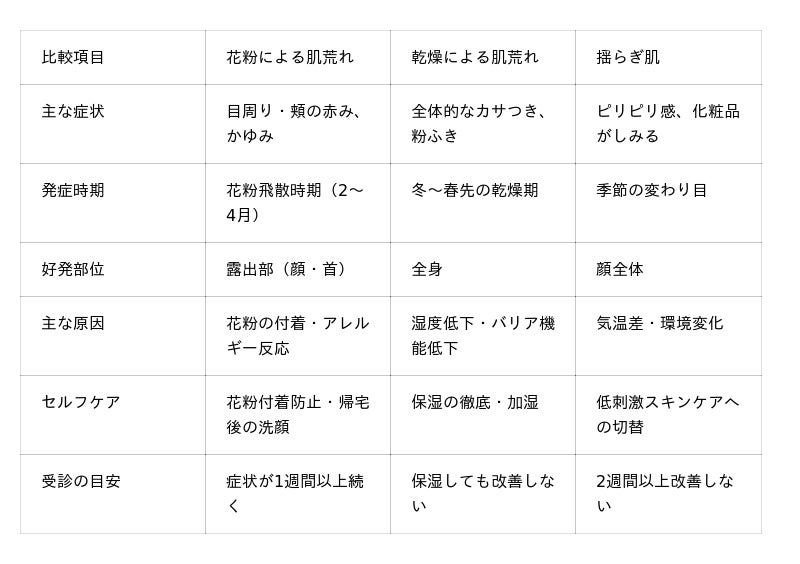 春先の肌荒れには主に3つのタイプがあります。1つ目は花粉が皮膚に付着して起こる「花粉皮膚炎」で、目の周りや頬に赤み・かゆみが生じます。2つ目は気温・湿度変化による「バリア機能の低下」で、全体的な乾燥やカサつきが特徴です。3つ目は環境変化に対応しきれない「揺らぎ肌」で、普段使っている化粧品がしみるようになります。