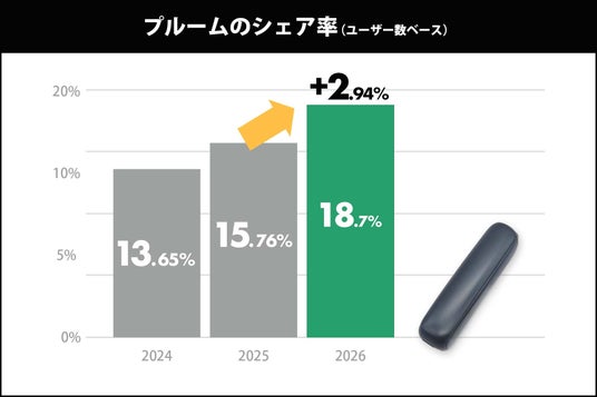 プルームは、2025年7月から投入されたコンパクトなデザインや機能性を改良した新型「Ploom AURA(プルーム・オーラ)」の好調や、積極的かつ地道なプロモーションにより、前年比+2.94%の伸びを見せ、過去最大のシェア率となりました。