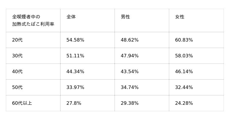 - 若年層の加熱式シフト: 20代の利用率は54.58%。特に20代女性は60%を超え、紙巻きたばこを逆転。