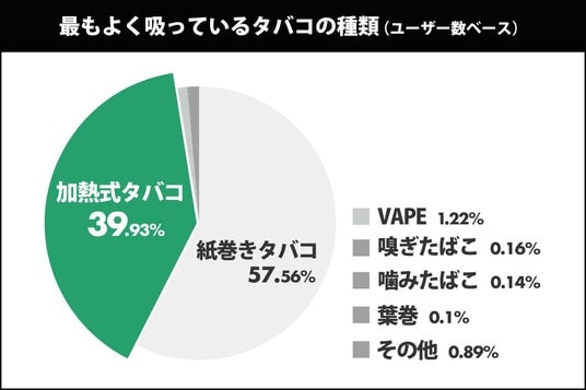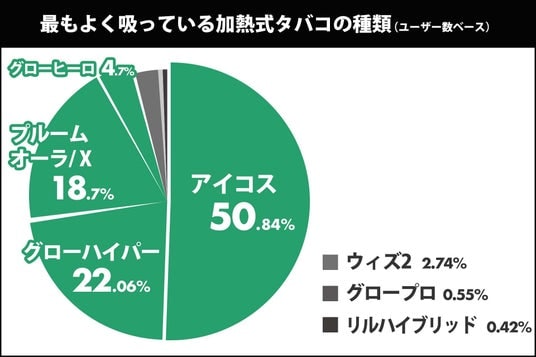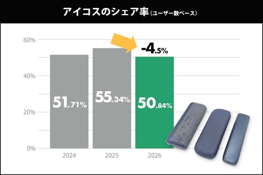 本調査の結果、加熱式たばこの市場シェアで長年首位を独走してきた「IQOS(アイコス)」のユーザーシェアが昨年比で約5%減少。