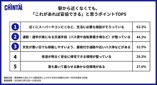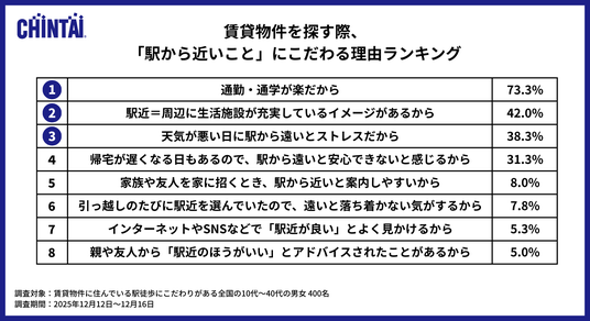 そこでCHINTAIでは、賃貸物件探しにおける「駅からの距離」や「築年数」に対する意識の実態や、その背景にある考え方を明らかにするため、本調査を実施しました。