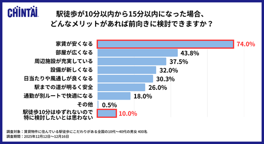このように、多くの人が駅距離を重視している一方で、「駅徒歩10分以内」から「15分以内」に条件が広がる場合に、どのようなメリットがあれば前向きに検討できるかを尋ねたところ、「駅徒歩10分はゆずれないので、特に検討したいとは思わない」と回答した人は10.0%にとどまりました。