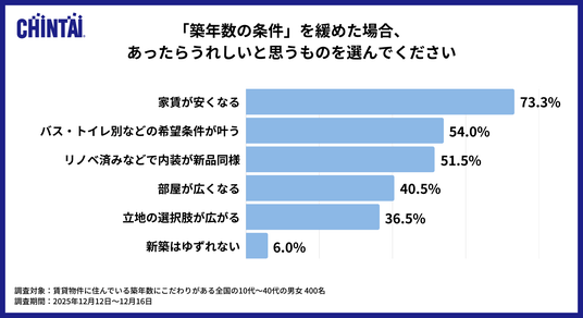 築年数の条件を緩めた場合に「あったらうれしいもの」では、「家賃が安くなる」が73.3%で最も多くなりました。次いで、「バス・トイレ別などの希望条件が叶う」が54.0%、「リノベ済みなどで内装が新品同様」が51.5%と続いています。一方で、「新築はゆずれない」と回答した人は6.0%にとどまりました。築年数の条件については、家賃や内装などの条件が整えば、多くの人が柔軟に検討していることがうかがえます。