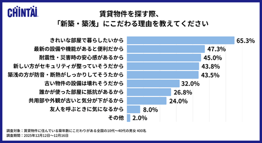 賃貸物件を探す際に「新築・築浅」にこだわる理由では、「きれいな部屋で暮らしたいから」が65.3%で最も多くなりました。次いで、「最新の設備や機能があると便利だから」(47.3%)、「耐震性・災害時の安心感があるから」(45.0%)、「新しい方が、セキュリティが整っていそうだから」(43.8%)が続いています。また、「築浅の方が防音・断熱がしっかりしていそうだから」も43.5%と、設備面や安全面に関する理由が上位に並びました。
