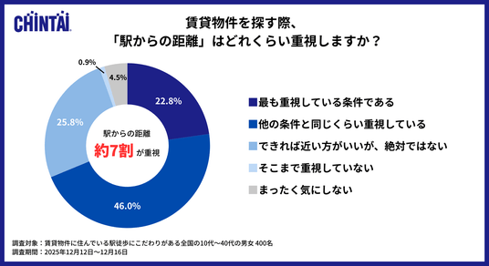 お部屋探しのリーディングカンパニー 株式会社CHINTAI(本社:東京都港区、代表取締役社長:奥田倫也、以下CHINTAI)は、賃貸物件で一人暮らしをしている20代~40代を対象に、お部屋探しにおける「駅からの距離」「築年数」に関するアンケート調査を実施しました。