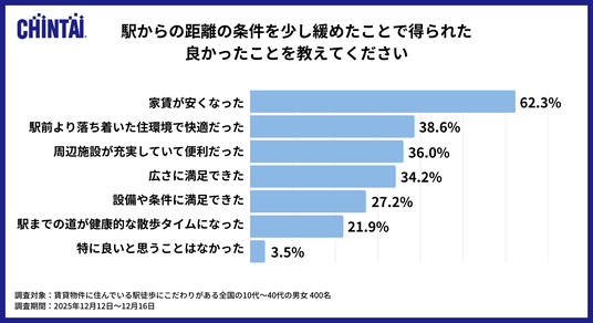 駅からの距離の条件を緩めた人に、実際に得られた良かった点を聞いたところ、「家賃が安くなった」が62.3%で最も多くなりました。次いで、「駅前より落ち着いた住環境で快適だった」(38.6%)、「周辺施設が充実していて便利だった」(36.0%)、「広さに満足できた」(34.2%)が続いています。一方で、「特に良いと思うことはなかった」は3.5%にとどまりました。