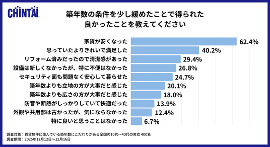 実際に築年数の条件を少し緩めて住んだ経験がある人に、良かったと感じた点を聞いたところ、「家賃が安くなった」が62.4%で最も多くなりました。次いで、「思っていたよりきれいで満足した」は40.2%、「リフォーム済みだったので清潔感があった」は29.4%となっています。