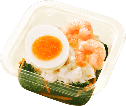 【内容】ブロッコリーに、マカロニ入りの具材感あるタルタルソースと海老をトッピングしたサラダです。