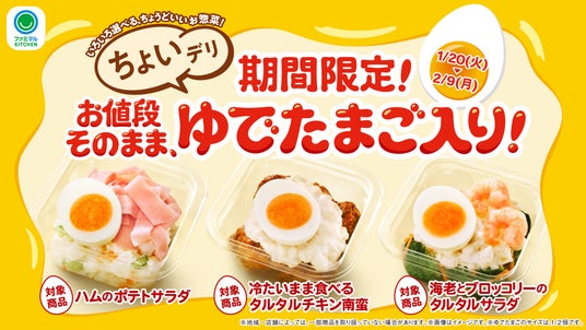 “いろいろ選べてちょうどいいお惣菜”として好評の「ちょいデリ」シリーズの一部商品に、1月20日(火)から2月9日(月)までの期間限定で、お値段そのままゆでたまごをトッピングしております。