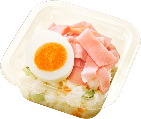 【内容】ハムをトッピングした、シンプルでコクのあるポテトサラダです。期間限定でゆでたまごをトッピングしました。