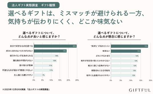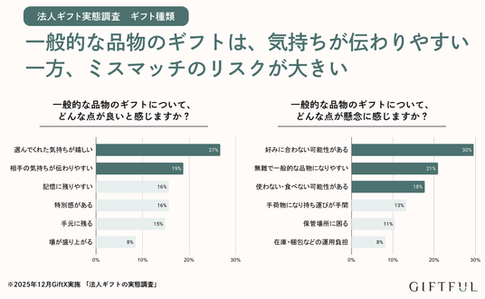 - 一方で懸念点として、好みに合わない、無難な品物になるなど、法人ギフト特有のミスマッチに関する点が挙げられている