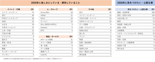 2026年に楽しみにしている、期待していることは、“イベント・行事”では「音楽イベント・ライブ」「旅行」に次いで「FIFAワールドカップ」「WBC」が続きます。“人・グループ”では、昨年に引き続き「Snow Man」が最も多く、次いで「HANA」、「M!LK」「たくろう」が上位でした。気をつけたい・心配なことは、「健康・体調管理」や「病気・怪我の予防」が大半を占めました。以下、「お金の使い方」「物価高・物価上昇」など金銭面の内容や、「災害」「詐欺・犯罪」「熊の出没」など昨年ニュースを賑わせた内容なども挙げられました。