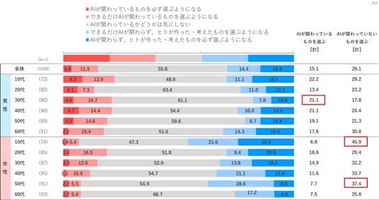 各種AIの利用経験、利用意向は「検索や情報収集」や「文書や資料などの作成や校正」がメインで、幅広い用途での利用にはまだ至っていない。商品やサービス、コンテンツの購入・利用時の選択意向としては、「AIが関わっているかどうかは気にしない」が半数以上を占めるものの、「AIが関わっているものを選ぶ」15.1%よりも、「AIが関わっていないものを選ぶ」29.1%が上回り、今後の動向が注目される。