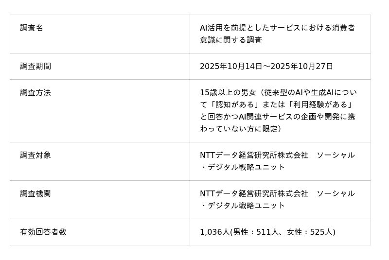 NTTドコモビジネスX株式会社(旧:NTTコム オンライン、本社:東京都品川区、代表取締役社長:稲葉 秀司、以下NTTドコモビジネスX)は、株式会社NTTデータ経営研究所(本社:東京都千代田区、代表取締役社長:山口 重樹、NTTデータ経営研究所)と共同で、NTTコム リサーチ登録モニターおよび協力企業を対象に「AI活用を前提としたサービスにおける消費者意識に関する調査」(以下、本調査)を実施しました。