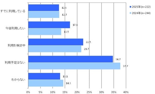 生成AIなどに利用されるGPUサーバーや高速な計算・解析を行うHPCサーバーなどの、高発熱・高排熱サーバー、高負荷サーバーの利用状況と利用意向を聞いたところ、「すでに利用している」が12.6%となりました。「今後利用したい」が17.1%、「利用を検討中」が22.5%となり、両者を合わせた利用に前向きな層は4.4ポイント増の39.6%となります。利用中から検討中まで含めて調査対象者の半分超が利用に興味を持っている状況です。売上規模が大きい企業ほど、利用率も利用意向も高い傾向があります。