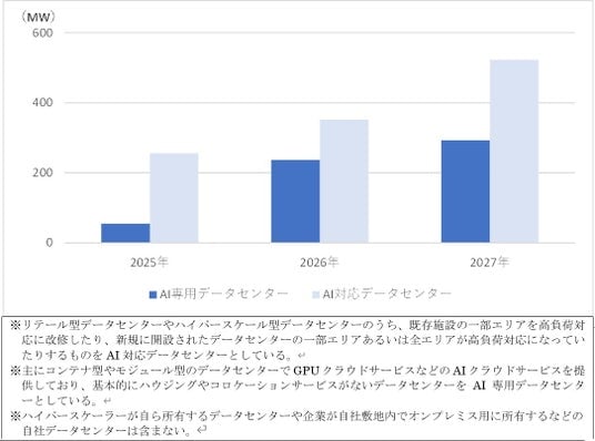 図表2は、国内における商用データセンターおよび自社サービス用データセンターのうち、AIサーバー(GPUサーバーやHPCサーバー)への対応を明言しているデータセンターのIT供給電力容量(キャパシティ)を集計したものです。