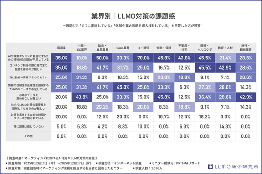 また、IT・通信やSaaS業界では技術的課題が相対的に高く、LLMO対策を単なるコンテンツ施策ではなく、検索やAIの仕組みを理解した上で設計すべきものとして捉えている姿勢が表れています。