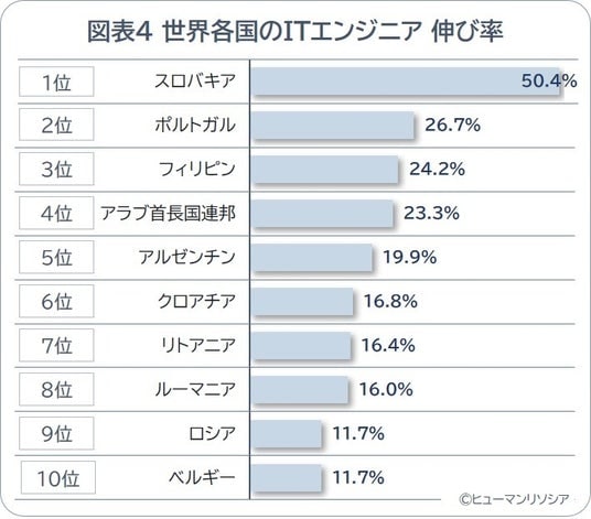 対前年での伸び率を国別でみると、1位は50.4%増と大幅増のスロバキアで、2位はポルトガル(26.7%増)、3位はフィリピン(24.2%増)も大きく伸長しています。ウクライナと国境を接するスロバキアとポーランド(11位)が上位に入っており、国際情勢に伴う人材移動やIT拠点の再配置の影響が考えられます。