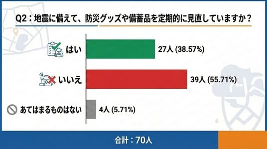 「防災グッズや備蓄品を定期的に見直していますか?」という問いに対し、「はい」と回答した人は27名(約39%)にとどまり、「いいえ」は39名(約56%)と半数を超えました。非常食の賞味期限切れや、ライフスタイルの変化による不足品など、備蓄は“用意しただけ”では不十分です。定期的な見直しが行われていない実態が明らかになりました。