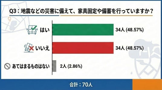 「地震などの災害に備えて、家具固定や備蓄を行っていますか?」という設問では、「はい」「いいえ」がともに34名(各約49%)とほぼ同数となりました。基本的な対策でありながら、実施している人とそうでない人の差が大きく、災害への備えが個人の意識や環境に委ねられている現状が浮き彫りとなっています。