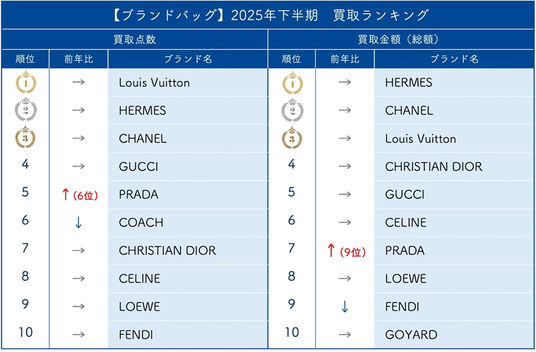 プラダは日本国内の相場が高く、海外から持ち込まれるケースが増えたことから、点数・金額ともにランクアップしたと考えられます。