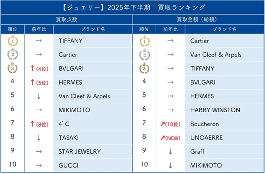 点数では、1位「ティファニー」、2位「カルティエ」、3位「ブルガリ」となりました。金額では、1位「カルティエ」、2位「ヴァンクリーフ&アーペル」、3位「ティファニー」と前年と変わらない結果となりました。