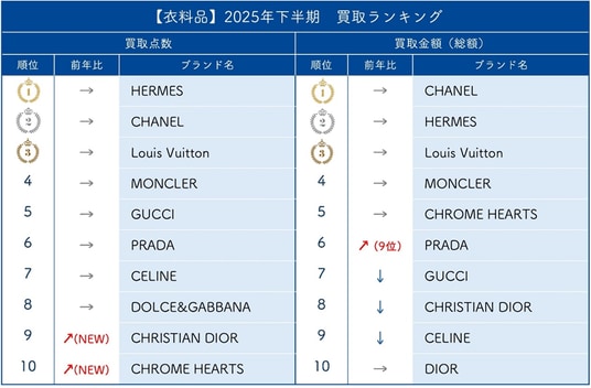 点数では、1位「エルメス」、2位「シャネル」、3位「ルイ・ヴィトン」という不動の結果となりました。変化があったのは、9位、10位。「クリスチャンディオール」と「クロムハーツ」がランクイン。金額では、1位「シャネル」、2位「エルメス」、3位「ルイ・ヴィトン」となりました。