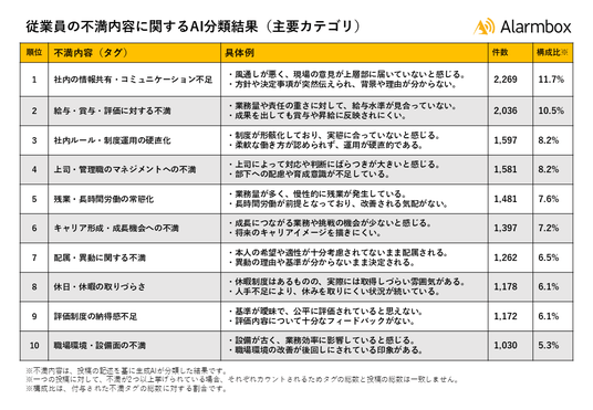 対象データ:インターネット上に投稿された口コミのうち、アラームボックスが「従業員による不満投稿」と分類したもの
