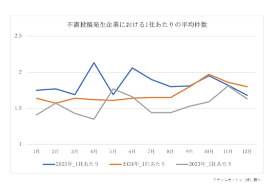 なお、2025年の推移を見ると、4月時点においても1社あたりの不満投稿件数が過去2年と比べて高い水準にありました。年度初期は比較的投稿量が落ち着く傾向も見られますが、特に2025年は、年内の月別比較においても4月の1社あたり件数が相対的に高く、新年度開始直後の段階から投稿密度が高い状態で推移していました。