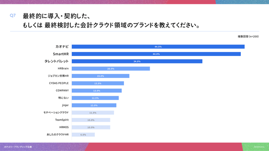 「Q7. 最終的に導入・契約した、もしくは最終検討したタレントマネジメント/HRプラットフォーム領域のブランドを教えてください。(複数回答)」(n=200)と質問したところ、「カオナビ」が44.5%、「SmartHR」が44.0%、「タレントパレット」が34.0%という回答となりました。