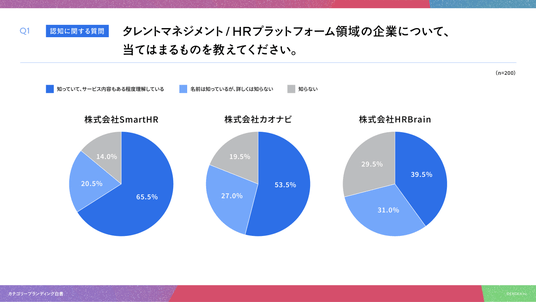 「Q1. タレントマネジメント/HRプラットフォーム領域の企業について、当てはまるものを教えてください。」(n=200)と質問したところ、株式会社SmartHRは「知っていて、サービス内容もある程度理解している」が65.5%、株式会社カオナビは「知っていて、サービス内容もある程度理解している」が53.5%、株式会社HRBrainは「知っていて、サービス内容もある程度理解している」が39.5%という回答となりました。