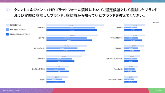 「Q3. タレントマネジメント/HRプラットフォーム領域において、選定候補として検討したブランドおよび実際に商談したブランド、商談前から知っていたブランドを教えてください。」(n=200)と質問したところ、選定候補ブランドは「SmartHR」が56.5%、実際に商談したブランドは「SmartHR」が47.0%、商談前から知っていたブランドは「SmartHR」が49.5%という回答となりました。
