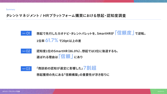 - 01|想起で先行したカオナビ・タレントパレットを、SmartHRが「信頼度」で逆転。1位率61.7%で20pt以上の差